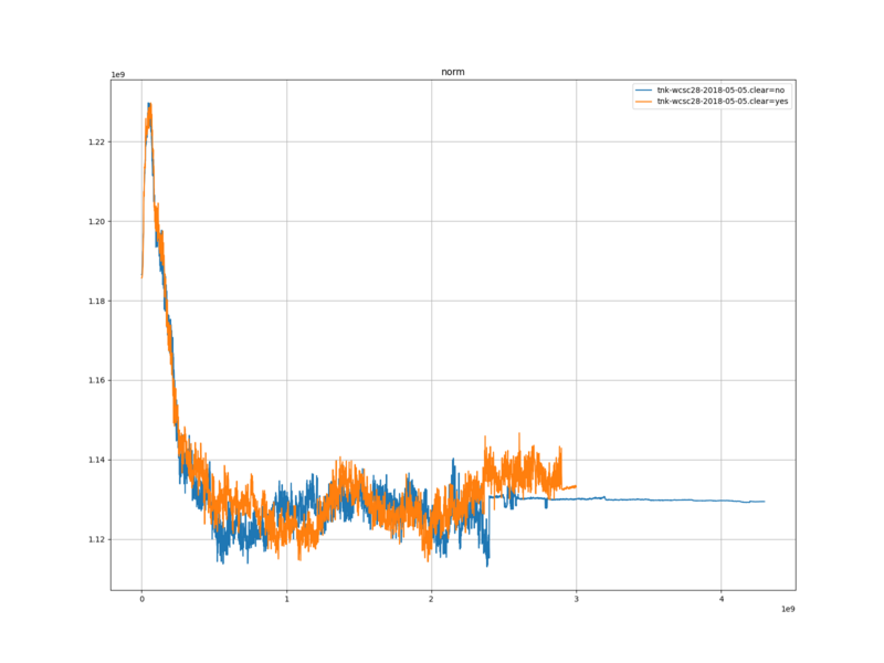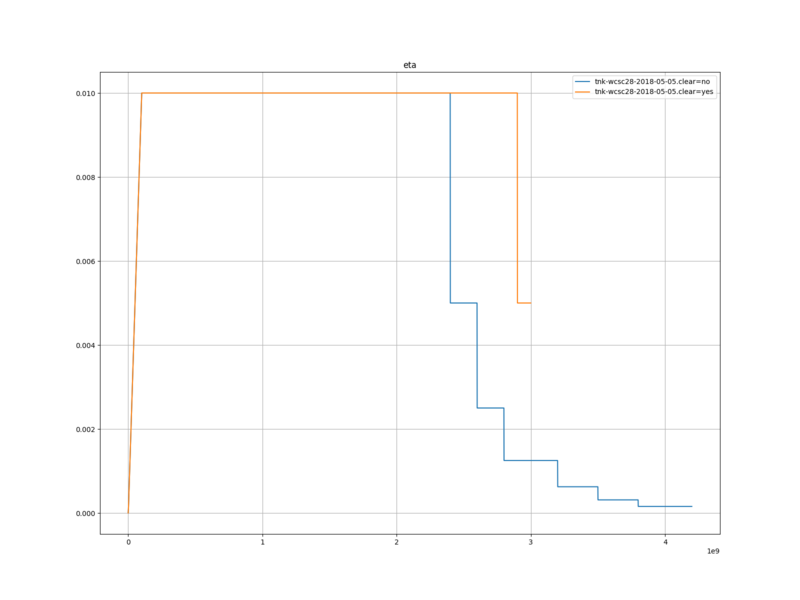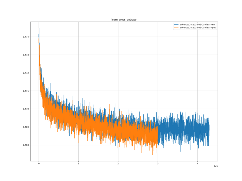 学習率は、置換表をクリアしたほうは、 1 度だけ下がったあと、学習がすぐに収束した。置換表をクリアしなかったほうは、 1 度下がったあと、何度か下がり、最終的には学習が収束した。
