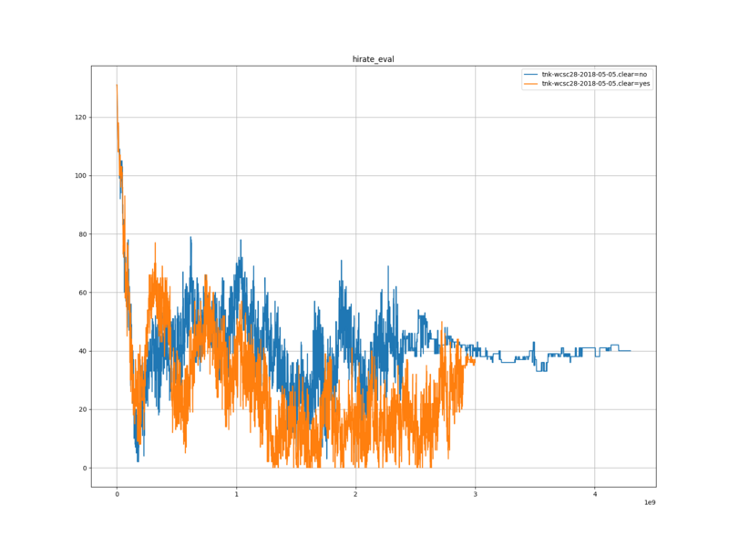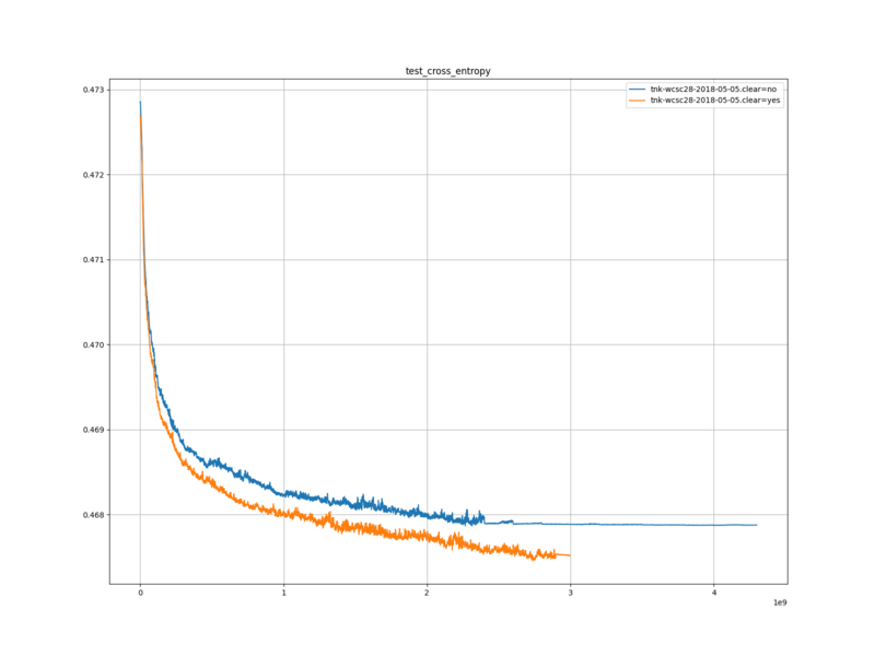 学習率については、置換表をクリアしたほうが、 1 度しか学習率が下がらなかったことを考えると、学習率を下げずとも十分な学習ができたことを表していると考える。この理由として、学習データの同じ局面の教師信号の分散が小さかったためだと考える。これは、置換表をクリアしたことによって、置換表の誤ったエントリーを参照する回数が減り、探索の結果が同じになりやすかったためだと考える。この仮説を証明するには、学習データ内の同一局面における、教師信号の分散を調べればよいと考える。